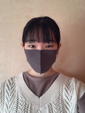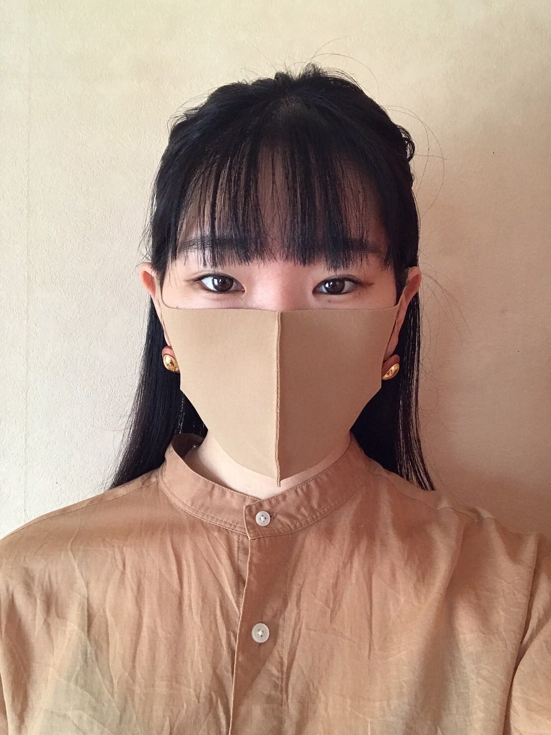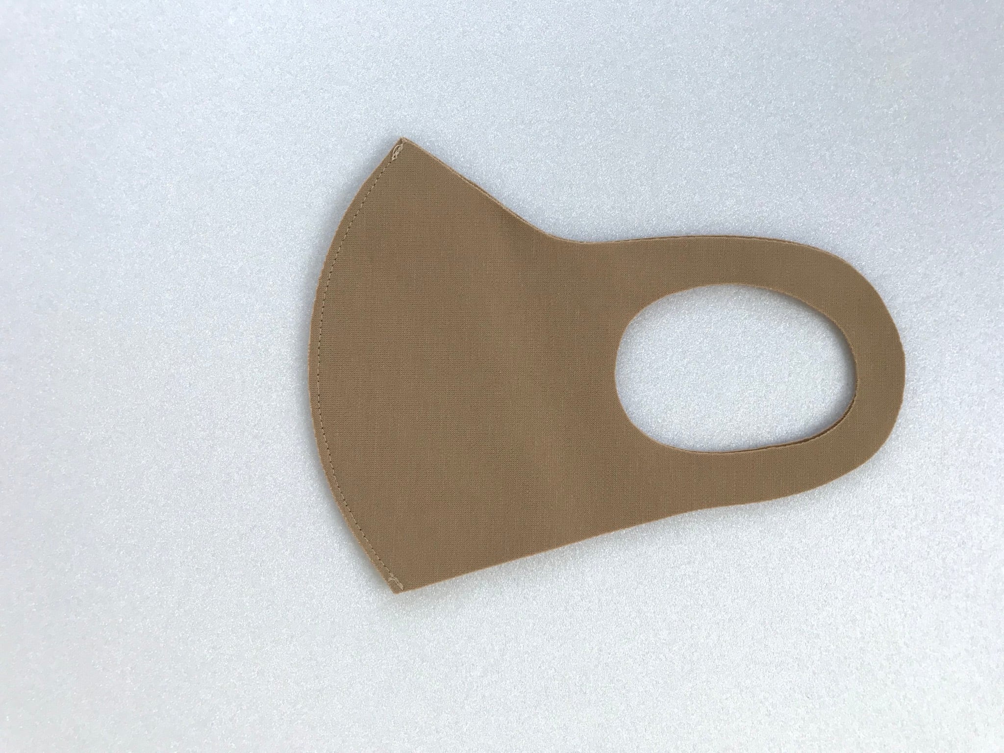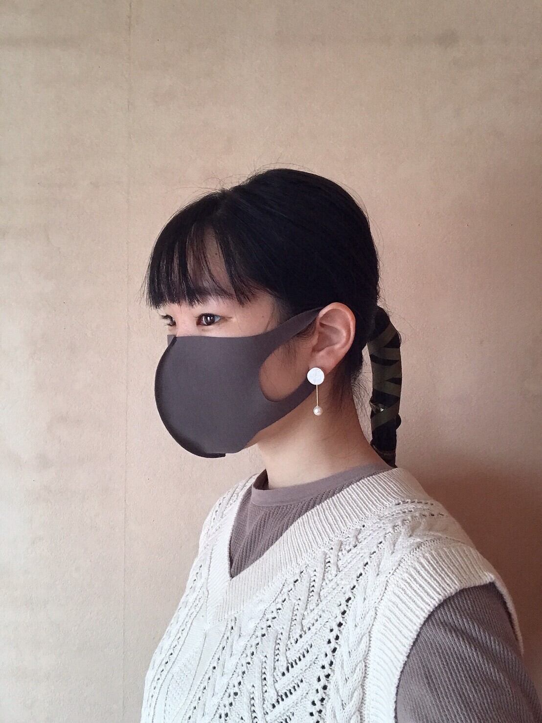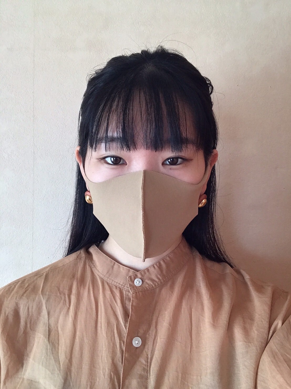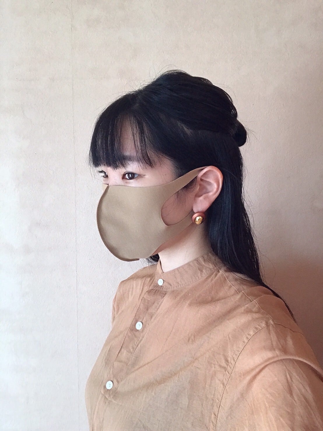 ニット生地を曲線でカット。極力縫製を省き、伸縮性を重視。耳への負担を軽減して、長時間の着用も苦にならない様デザインされています。上下を変えられる仕様でカットを山型(眼鏡着用時に曇りにくい)フラット(小顔効果でスッキリ)お好みで使い分けができます。