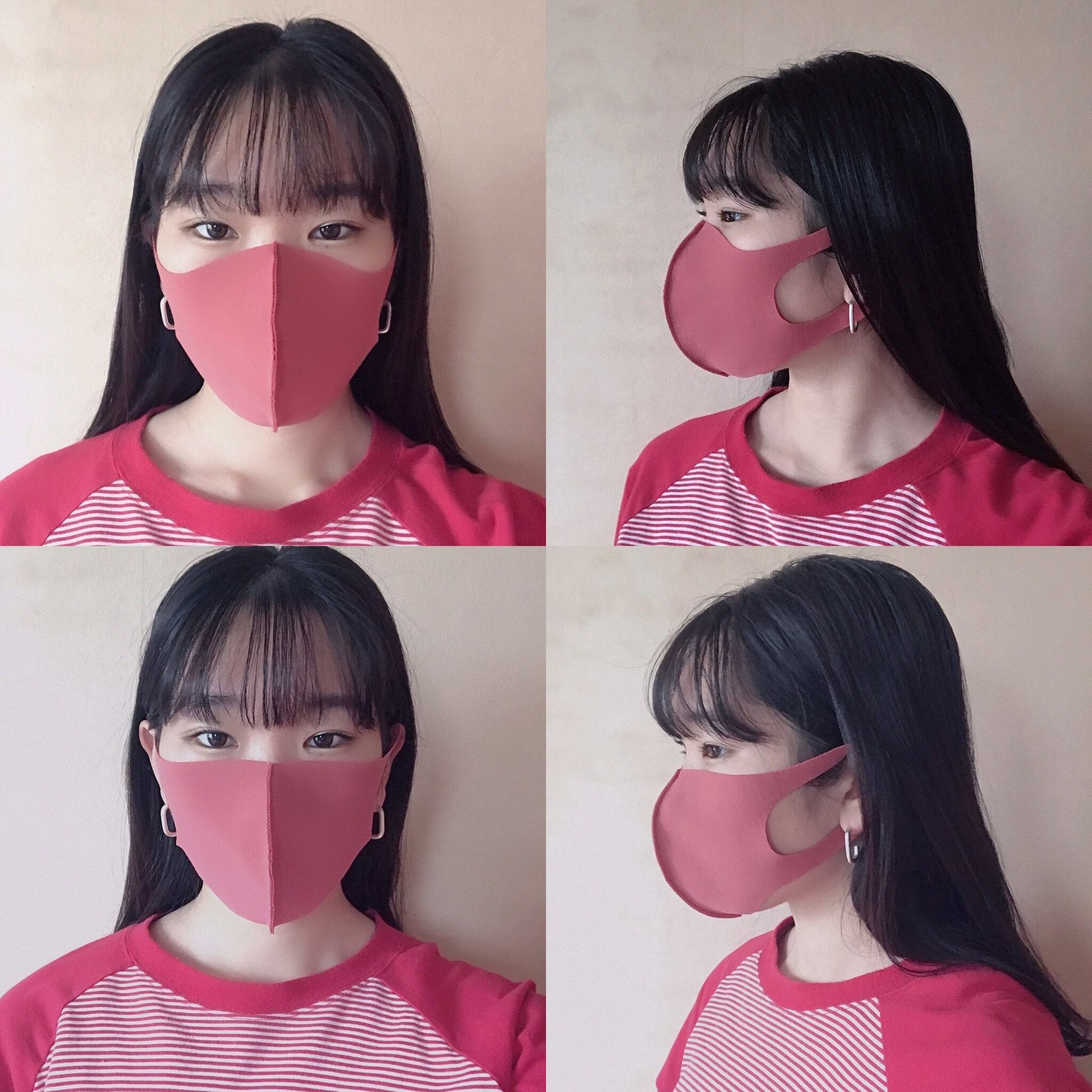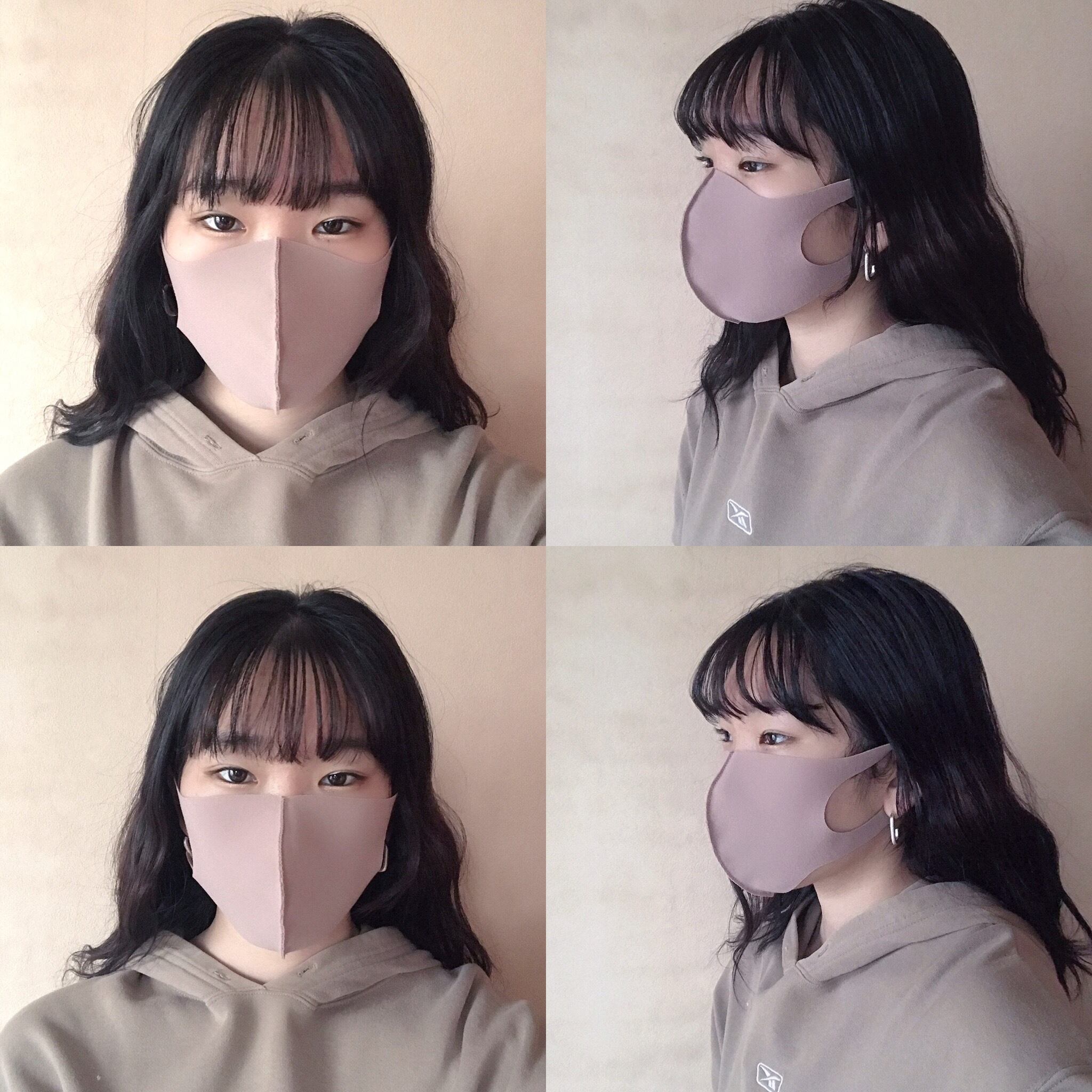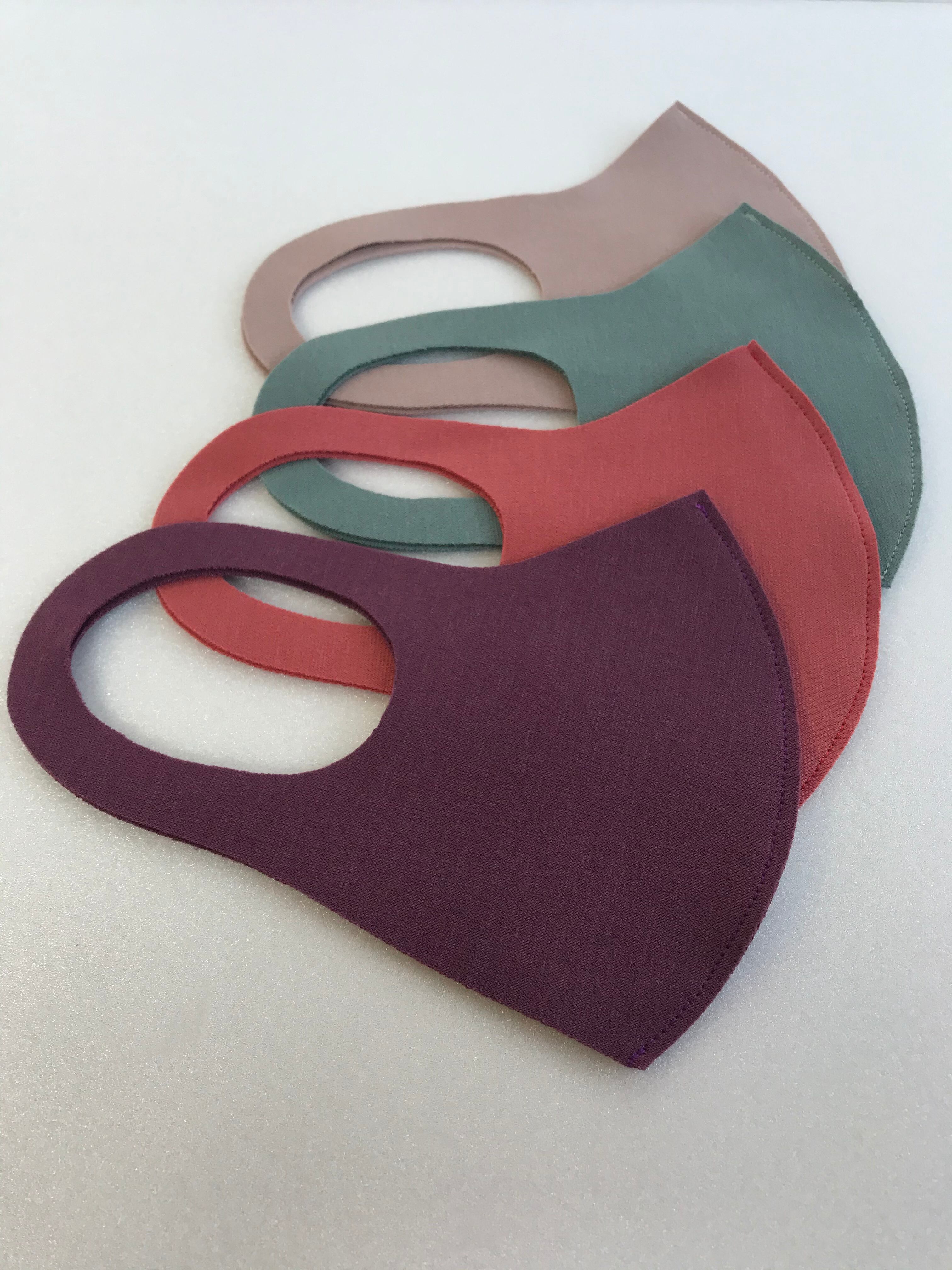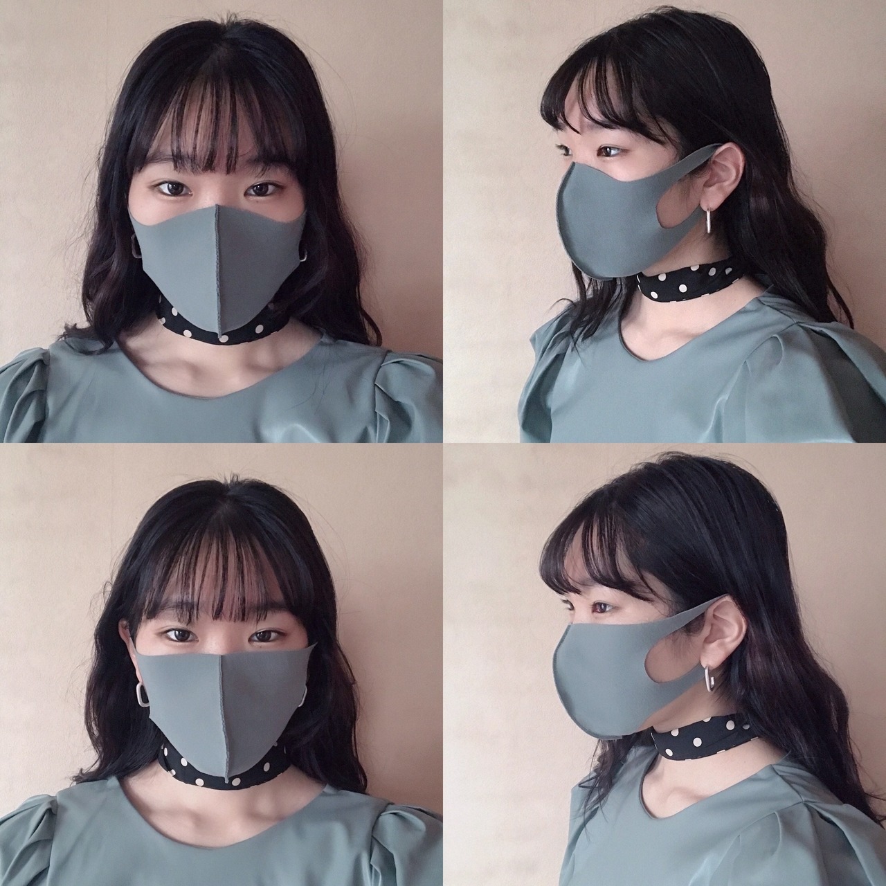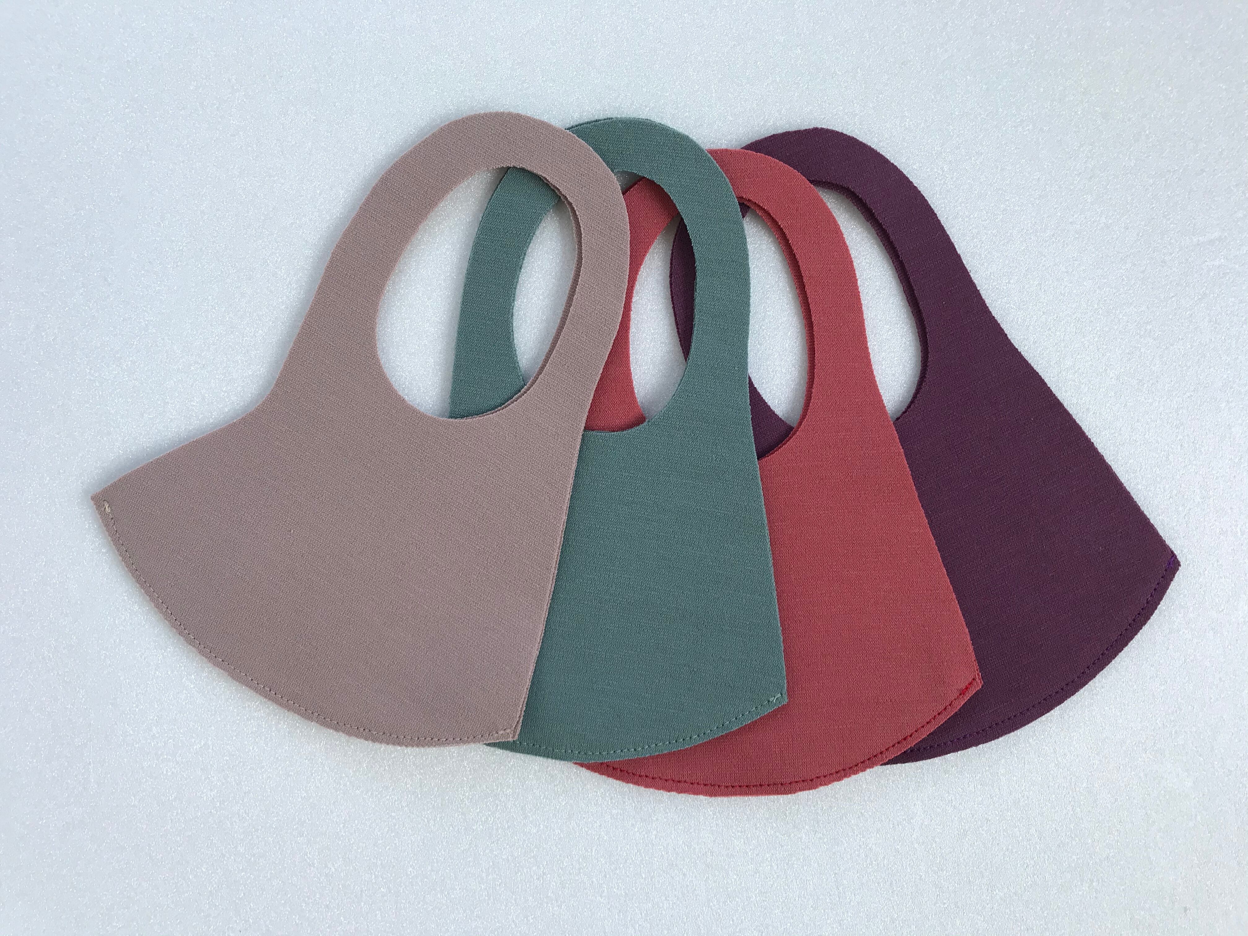 ニット生地を曲線でカット。極力縫製を省き、伸縮性を重視。耳への負担を軽減して、長時間の着用も苦にならない様デザインされています。上下を変えられる仕様でカットを山型(眼鏡着用時に曇りにくい)フラット(小顔効果でスッキリ)お好みで使い分けができます。